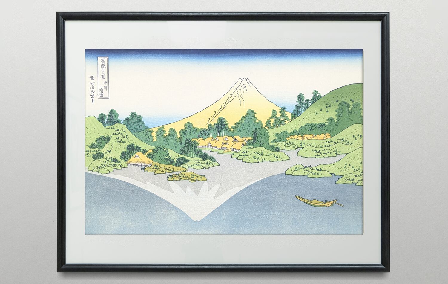 葛飾北斎の名作「冨嶽三十六景 甲州三坂水面」。この作品には、優雅に描かれた富士山とその周囲の自然が見事に調和し、北斎の豊かな色彩感覚と構成力が光ります。日本の美を感じさせるこの作品は、時を超えて多くの人々に愛され続けています。